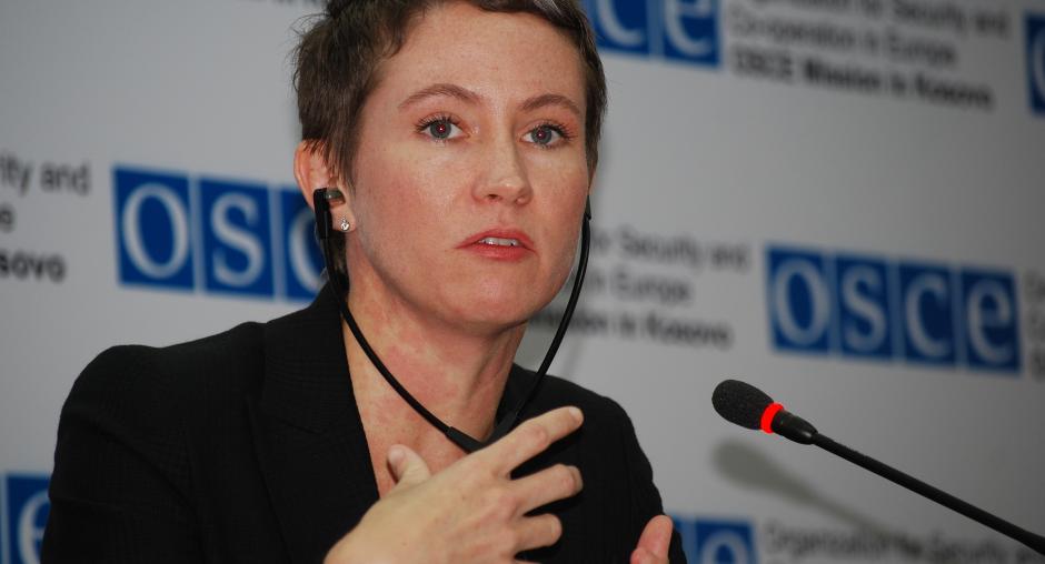 OSCE Mission in Kosovo Legal Adviser, Emily Patterson, answers a journalist's question at a press conference to announce the release of a report on disputes over immovable property rights, Prishtine/Pristina, 6 April 2009. (OSCE/Hasan Sopa)