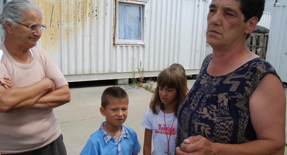 Olgica Subotic (l) and one of her neighbours in the Vocar settlement in Gracanice/Gracanica explain their dire living conditions to OSCE Mission in Kosovo Senior Public Affairs Officer Nikola Gaon (r), Kosovo, 18 June 2009. (OSCE/Hasan Sopa)