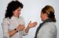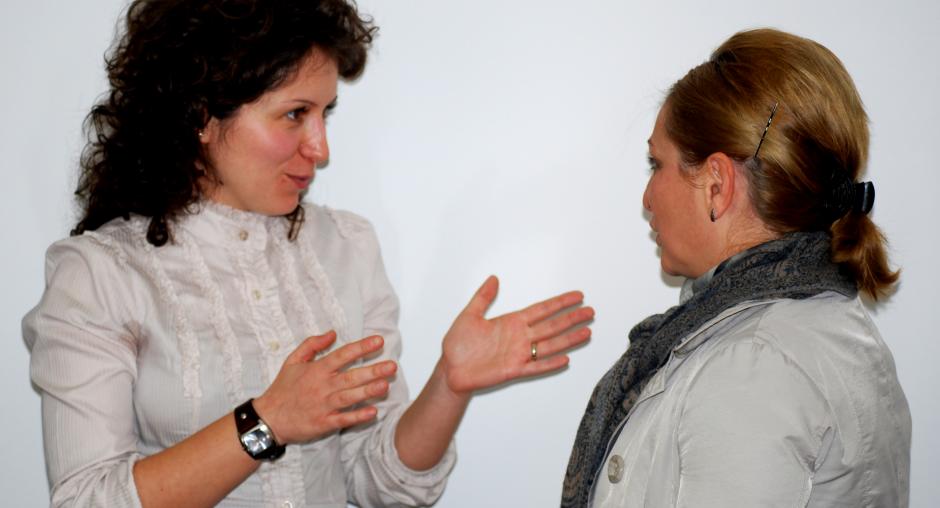 Dafina Hadri, OSCE National Legal Adviser on Women and Children, talks to Ganimete Kitmiri, advisor at the Kosovo Ministry of Justice, at the launch of the Mission's anti-trafficking campaign in Prizren, 4 December 2009. (OSCE/Hasan Sopa)