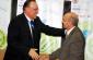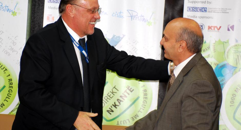 Isa Mustafa, Mayor of Prishtine/Pristina municipality (r), greets Bo-Ewert Linne, Director of the OSCE Regional Office in Prishtine/Pristina, at a press conference on the launch of a garbage awareness campaign supported by the Mission, 30 September 2009. (OSCE/Hasan Sopa)