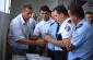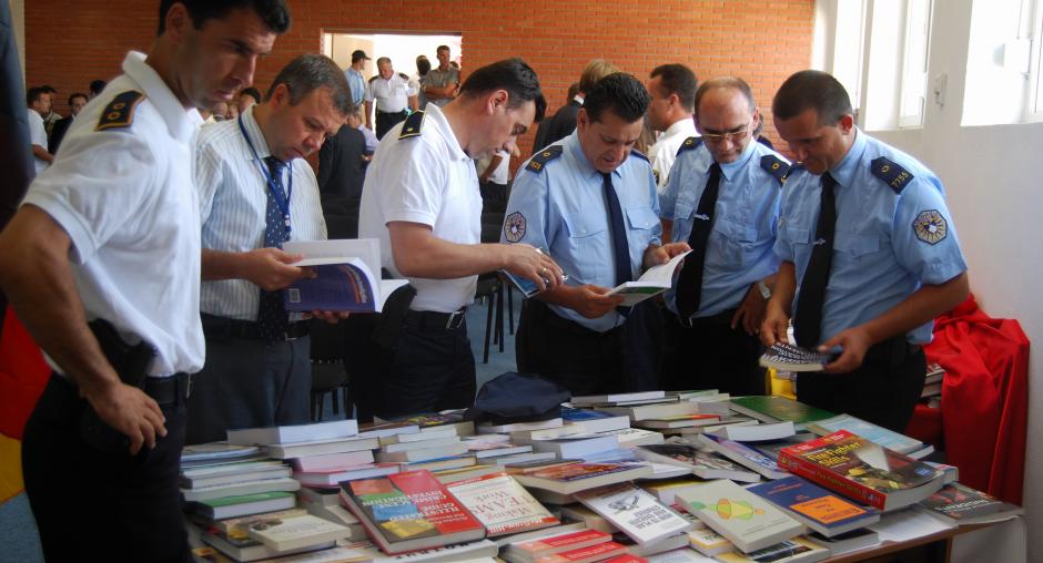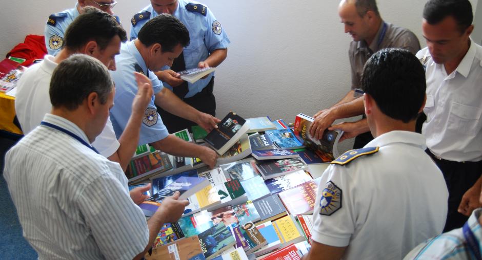 Kosovo police officers examine teaching materials at a handover ceremony for equipment donated by the German Embassy to the Security and Public Safety Agency in Kosovo, Vushtrri/Vucitrn, 20 July 2009. (OSCE/Hasan Sopa)