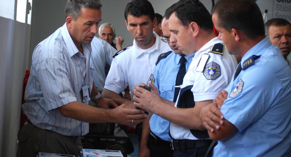 Kosovo police officers look at night vision devices at a handover ceremony for equipment donated by the German Embassy to the Security and Public Safety Agency in Kosovo, Vushtrri/Vucitrn, 20 July 2009. (OSCE/Hasan Sopa)