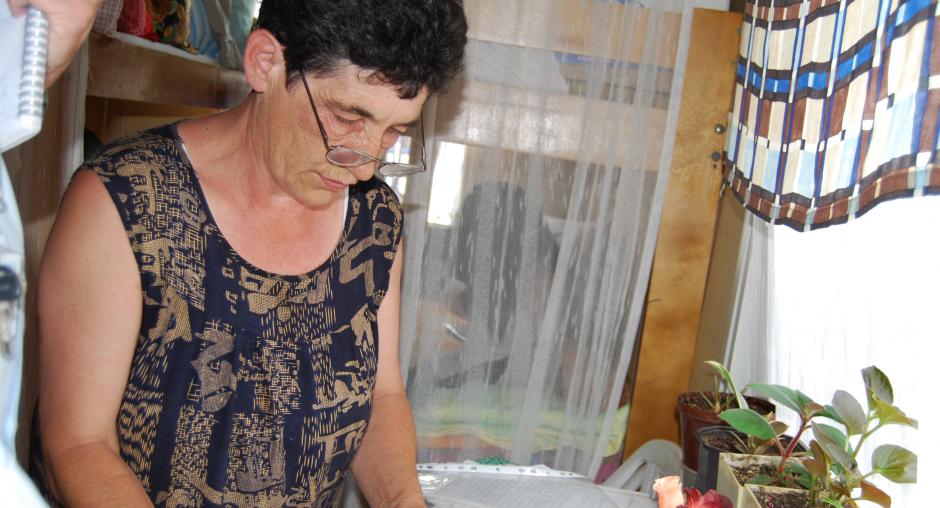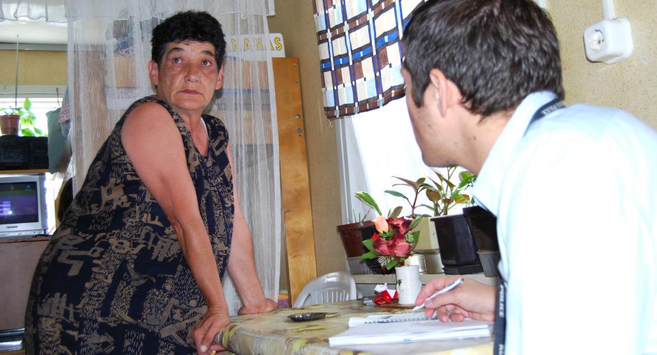 Olgica Subotic (l), explains to OSCE Mission in Kosovo Senior Public Affairs Officer Nikola Gaon (r) how she ended up as a resident of the Vocar settlement after the March 2004 riots in Kosovo, 18 June 2009. (OSCE/Hasan Sopa)