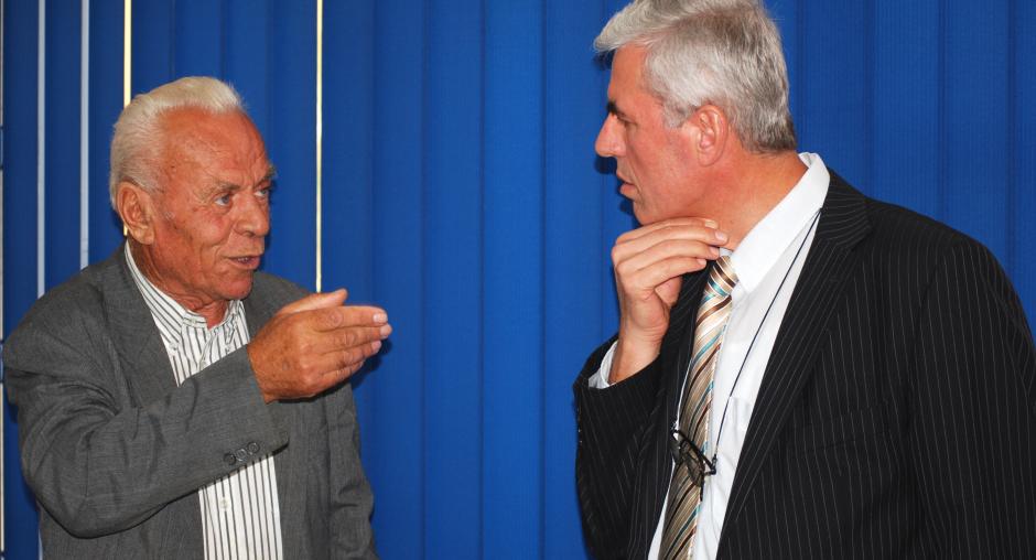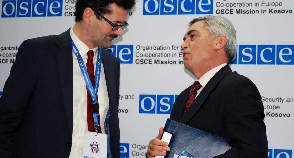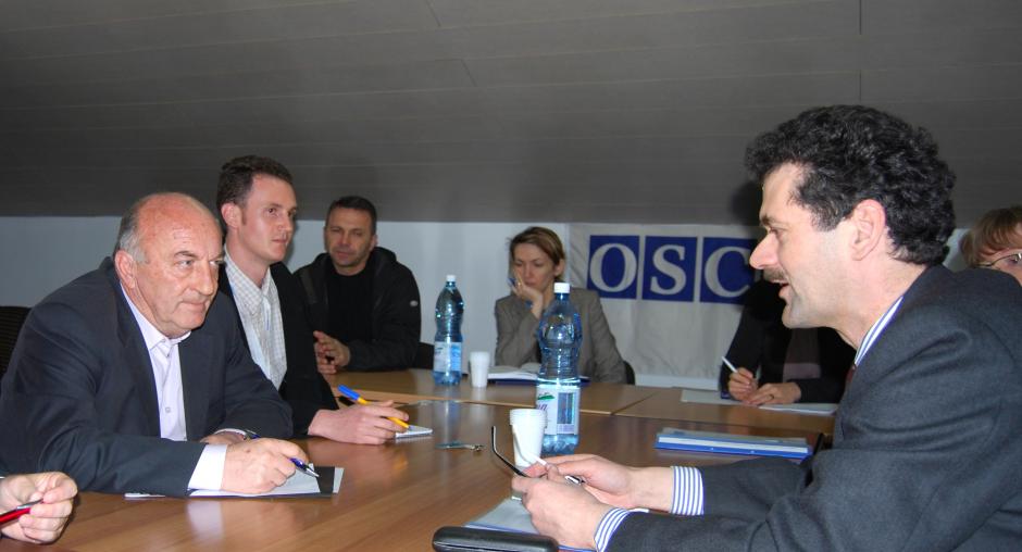 Sami Kurteshi, Kosovo's first local Ombudsperson (r), listens to the concerns of a local Serb after a press conference organized by his institution and the OSCE Mission in Kosovo at the media centre in Gracanica/Gracanice, 8 September 2009. (OSCE/Hasan Sopa)