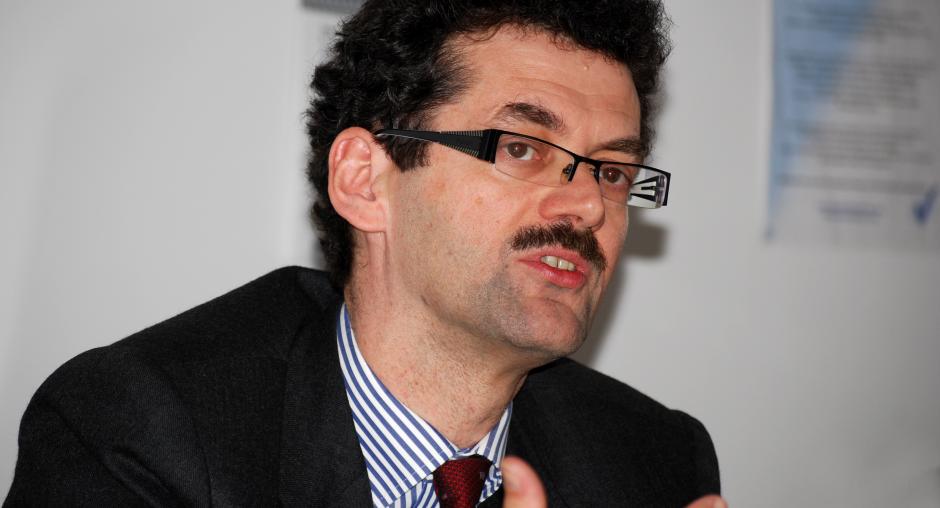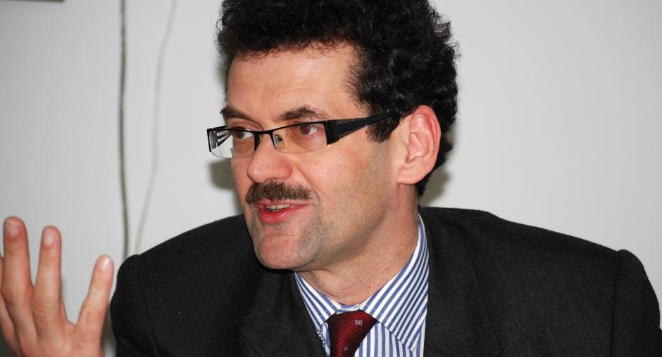 Francis Carlier, Director of the OSCE Regional Office in Prizren, talks to the media at the launch of the Mission's anti-trafficking campaign in Prizren, 4 December 2009. (OSCE/Hasan Sopa)
