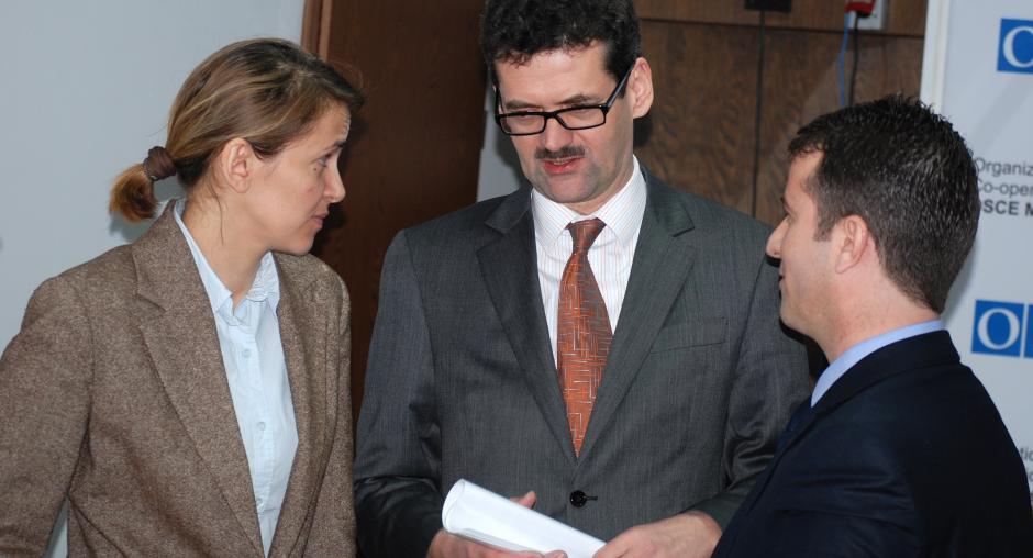 L-r: Acting Spokesperson of the OSCE Mission in Kosovo Edita Bucaj, Head of Mission Werner Almhofer, and Chief of the Independent Oversight Board (IOB) Mehdi Geci, at the launch of a campaign to support the IOB, Prishtine/Pristina, 14 December 2009. (OSCE/Hasan Sopa)