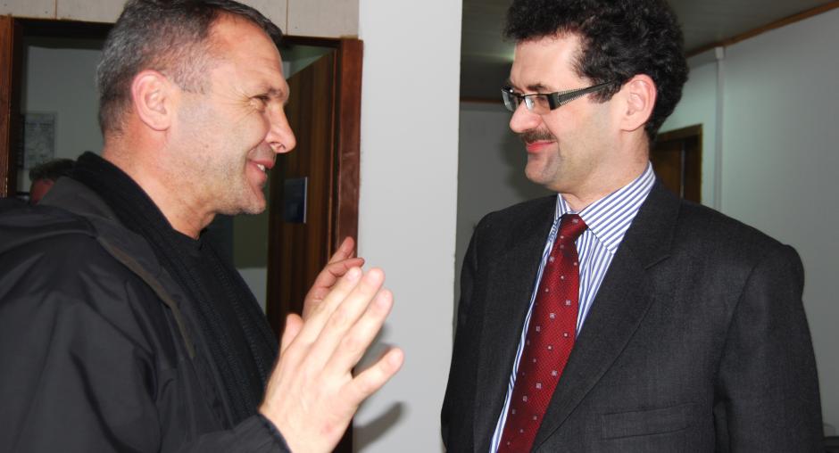 Ambassador Werner Almhofer (r), Head of the OSCE Mission in Kosovo, meets Stanko Jakovlevic (first left), Mayor of Strpce/Shterpce municipality, during a visit to the region, Strpce/Shterpce, 5 March 2009. (OSCE/Hasan Sopa)