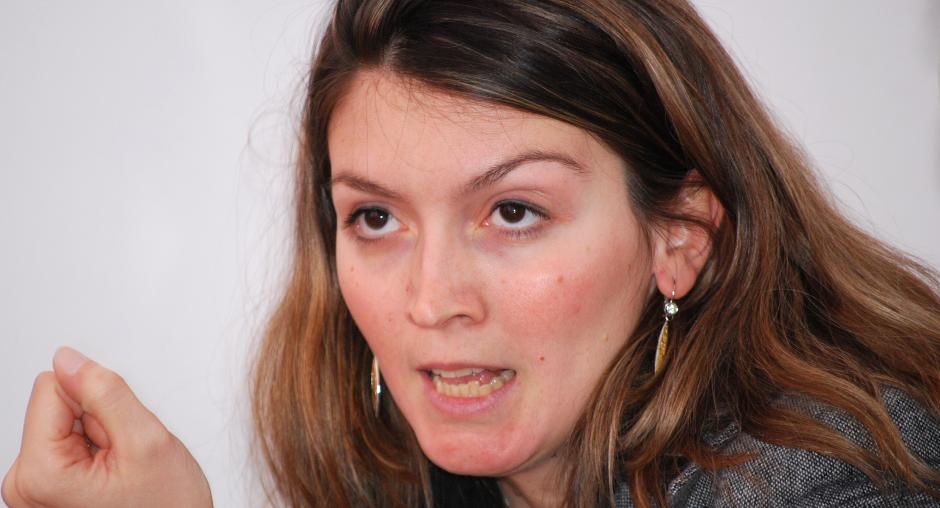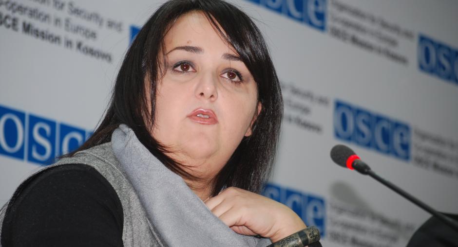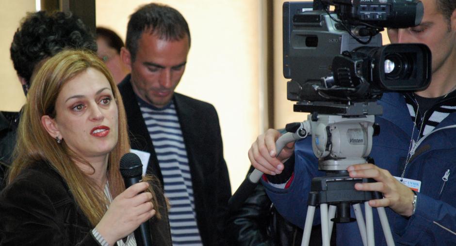 Top Channel TV journalist Valdete Osmani poses a question to the panel at the launch of a campaign to combat child begging sponsored by the OSCE Mission in Kosovo, Prishtine/Pristina, 9 October 2009. (OSCE/Hasan Sopa)