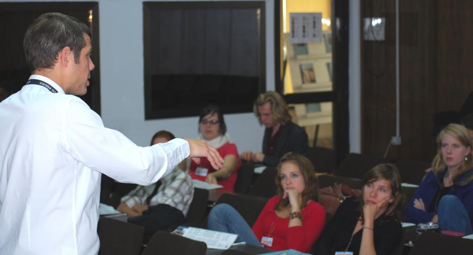Nikola Gaon, the OSCE Mission in Kosovo's Senior Public Affairs Officer, explains the Mission's role to students from various universities in Germany during their visit to headquarters, Prishtine/Pristina, 2 OCtober 2009. (OSCE/Hasan Sopa)