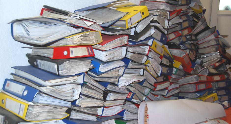 A pile of files stored in the hall of Decan/Decane Municipality Assembly will be filed thanks to the OSCE support programme to establish a comprehensive municipal archive, Decan/Decane, 22 December 2009. (OSCE/Hasan Sopa)
