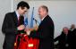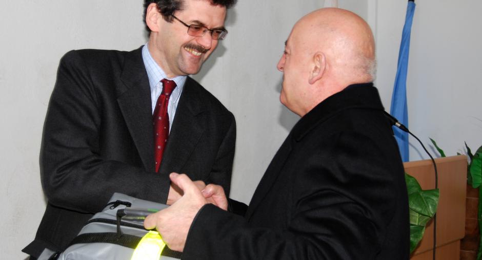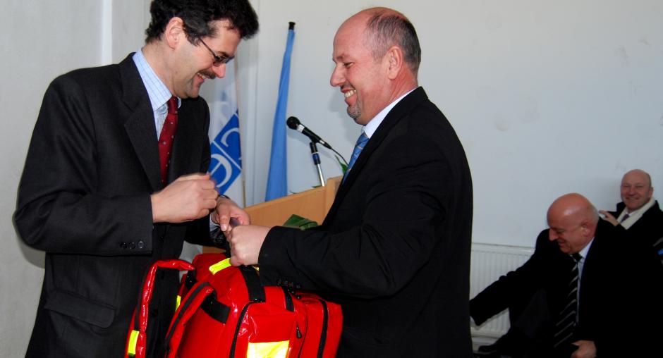 Ambassador Werner Almhofer (l), Head of the OSCE Mission in Kosovo, hands over OSCE-donated first aid bags to Haki Dragusha, from the Ambulance Services in Prishtine/Pristina, 9 March 2009. (OSCE/Hasan Sopa)