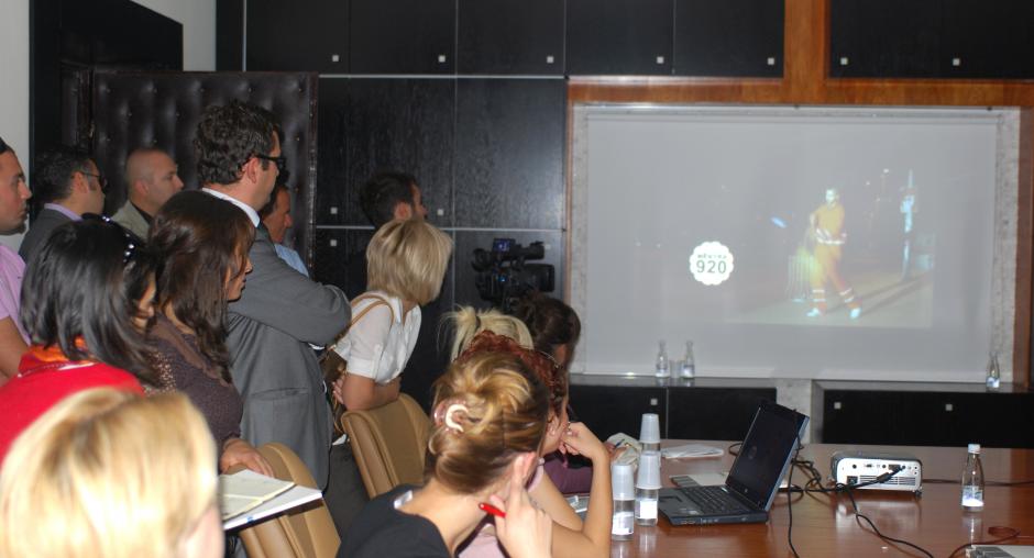 Journalists from the Kosovo media watch a TV spot at the launch of a garbage awareness campaign organized by Prishtine/Pristina municipality and supported by the OSCE Mission in Kosovo, Prishtine/Pristina, 30 September 2009. (OSCE/Hasan Sopa)
