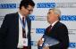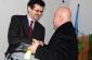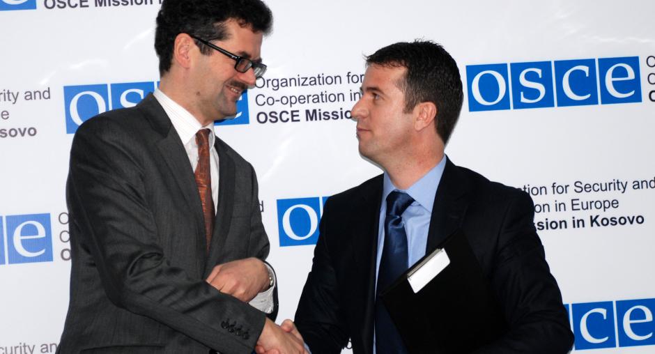 Head of the OSCE Mission in Kosovo Ambasador Werner Almhofer shaking hands with the Chief of the Independent Oversight Board (IOB) Mehdi Geci, at the launch of the Mission in Kosovo's campaign in support of the IOB, Prishtine/Pristina, 14 December 2009. (OSCE/Hasan Sopa)