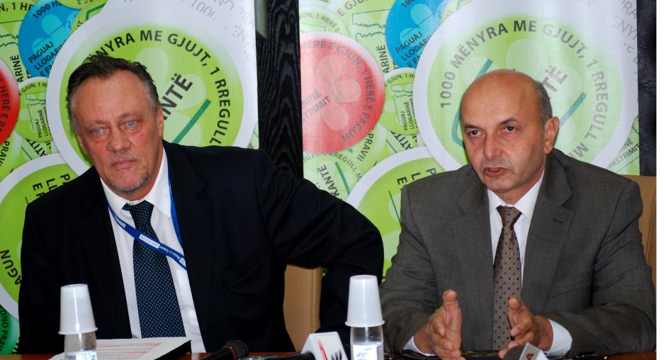 Isa Mustafa, Mayor of Prishtine/Pristina municipality (r) and Bo-Ewert Linne, Director of the OSCE Regional Office in Prishtine/Pristina, brief journalists on the launch of a garbage awarenesss campaign supported by the Mission, 30 September 2009. (OSCE/Hasan Sopa)