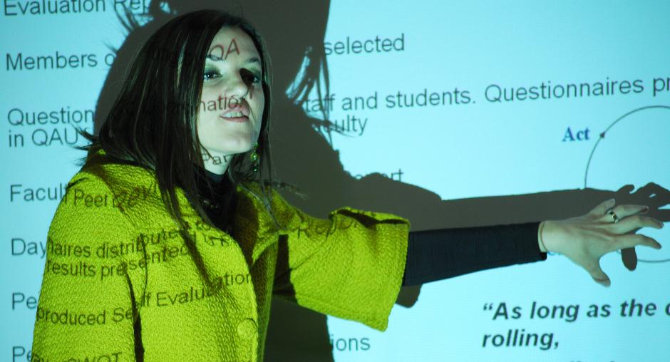 Mimoza Ibrani, Director of the Academic Development Office at the University of Prishtina explains the Mission-supported process of quality assurance in teaching practices in a seminar held at the University, Prishtine/Prstina, 17 December 2008. (OSCE/Hasan Sopa)
