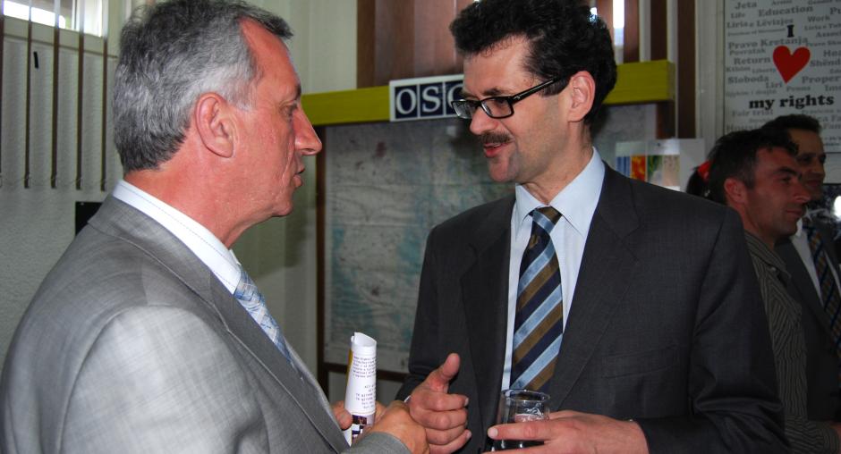 Head of the OSCE Mission in Kosovo, Werner Almhofer (r), meets the Mayor of Gjilan/Gnjilane municipality, Qemajl Mustafa, at a photo exhibition organized by members of the Human Rights Club from Gjilan/Gnjilane and supported by the Mission, 27 April 2009. (OSCE/Hasan Sopa)
