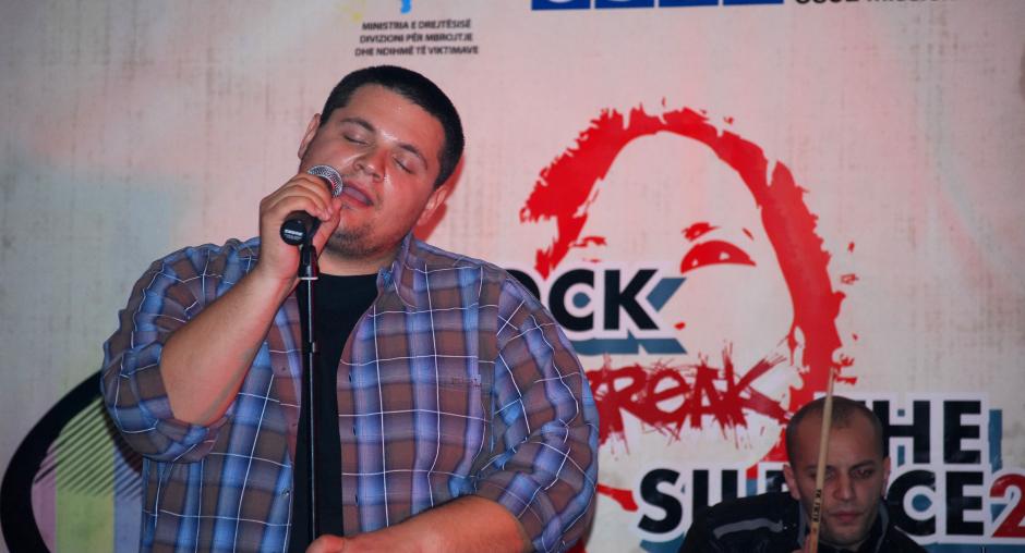 A band performs at a "Rock to break the silence 2! Report human trafficking!" concert to promote Kosovo's anti-trafficking helpline, Mitrovice/Mitrovica, 5 December 2009. (OSCE/Nikola Gaon)