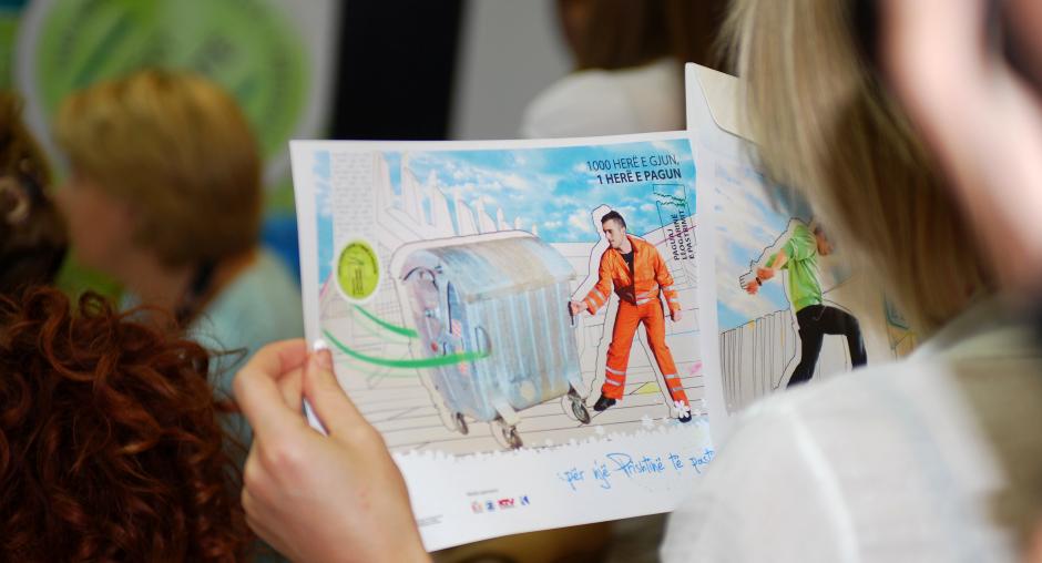A journalist from the Kosovo media looks at a printout of a poster during the launch of a garbage awareness campaign organized by Prishtine/Pristina municipality supported by the OSCE Mission in Kosovo, Prishtine/Pristina, 30 September 2009. (OSCE/Hasan Sopa)