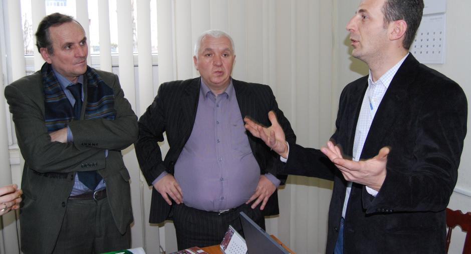 Stanko Jakovlevic (r), Mayor of Strpce/Shterpce; his Deputy Ali Halimi (c), and Jeton Lika, member of the OSCE municipal team, at a meeting with Ambassador Werner Almhofer, Head of the OSCE Mission in Kosovo, Strpce/Shterpce, 5 March 2009. (OSCE/Hasan Sopa)