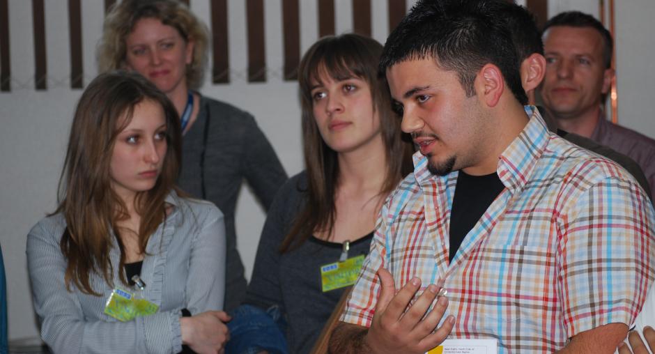A student poses a question during the visit of a group from various universities in Germany to the headquarters of the OSCE Mission in Kosovo, Prishtine/Pristina, 2 October 2009. (OSCE/Hasan Sopa)