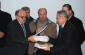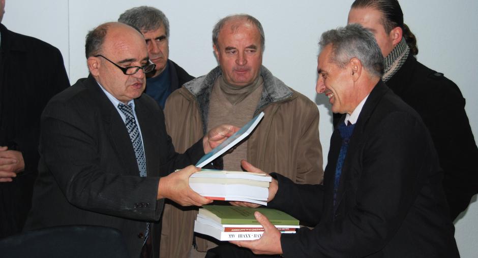 Jusuf Osmani (l) Chief Executive of the Kosovo Archive Agency hands over guide books on archiving to Ibish Gervalla, manager of the Decan/Decane Municipal Archive, at its inauguration ceremony, Decan/Decane, 22 December 2009. (OSCE/Hasan Sopa)