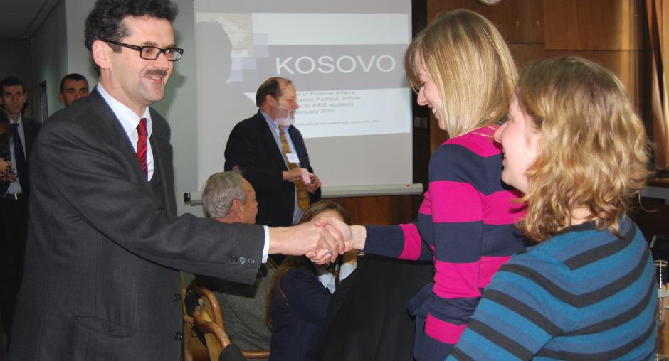 The Head of the OSCE Mission in Kosovo, Ambassador Werner Almhofer, receives a group of students from Johns Hopkins University during a visit to Mission headquarters in Kosovo, Prishtine/Pristina, 21 January 2010. (OSCE/Hasan Sopa)