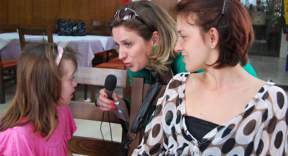 One of the children from Kosovo's multiethnic group of 'Child Ambassadors' is interviewed by a journalist during their visit to the OSCE Mission's headquarters on the International Children's Day, Prishtine/Pristina, 1 June 2009. (OSCE/Hasan Sopa)