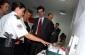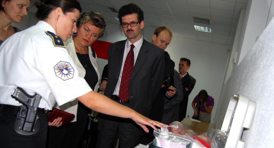 A Kosovo police service officer shows Ambassador of Czech Republic Janina Hrebickova (middle) and Head of OSCE Mission in Kosovo Werner Almhofer (right) new equipment received for the crime scene simulation room, Vushtrri/Vucitrn, 17 June 2009. (OSCE/Hasan Sopa)