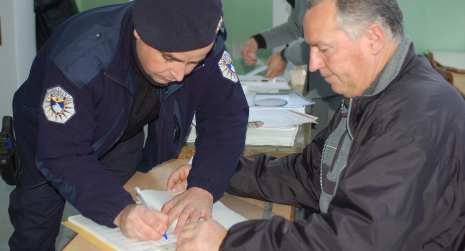 A Kosovo police officer casts his ballot at "Jeta Re" secondary school polling station in Suhareke/Suvareka municipality, 17 November 2007. Police officers were given time off to vote in the elections. (OSCE/Hasan Sopa)
