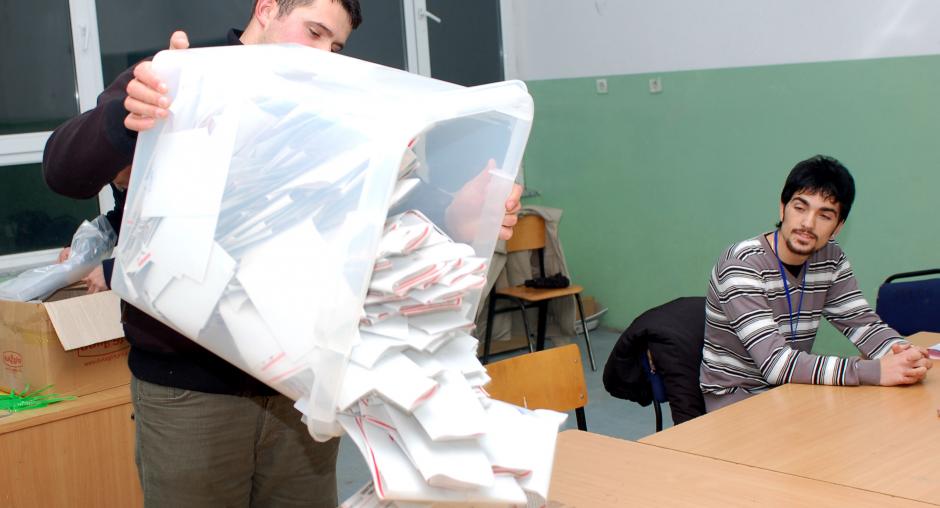 Members of the polling station at "Vellezerit Frasheri" Primary School, Bukosh village in Suhareke/Suva Reka Municipality, start counting the ballots from Kosovo's elections on 17 November 2007. (OSCE/Hasan Sopa)