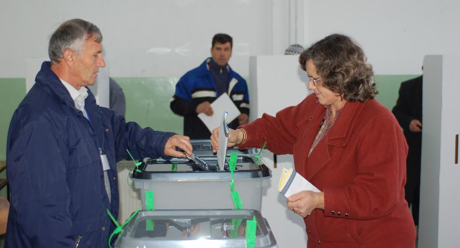 A voter casts her ballot at "Motrat Qiriazi" Primary School polling station in Prizren Municipality during Kosovo's elections, 17 November 2007. (OSCE/Hasan Sopa)