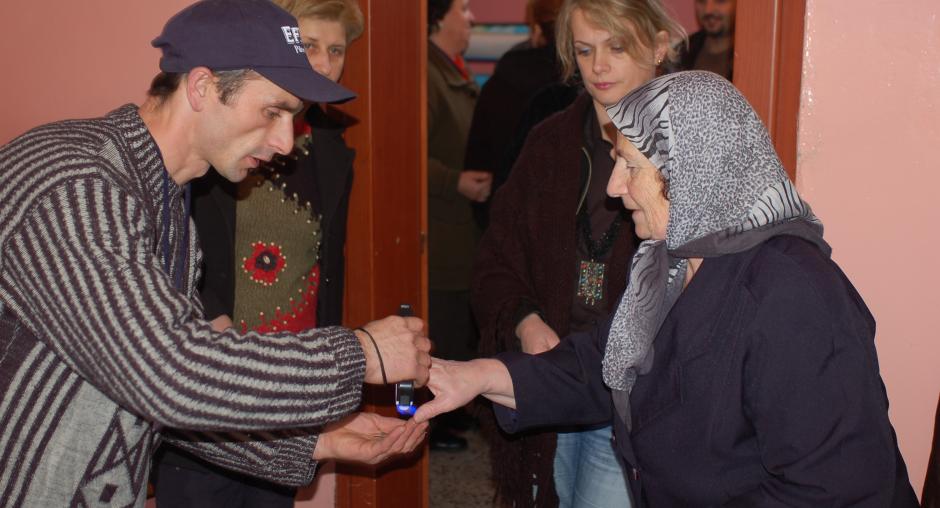 An election official at "Motrat Qiriazi" Primary School polling station in Prizren checks voters' fingers at the station's entrance during Kosovo's elections, 17 November 2007. (OSCE/Hasan Sopa)