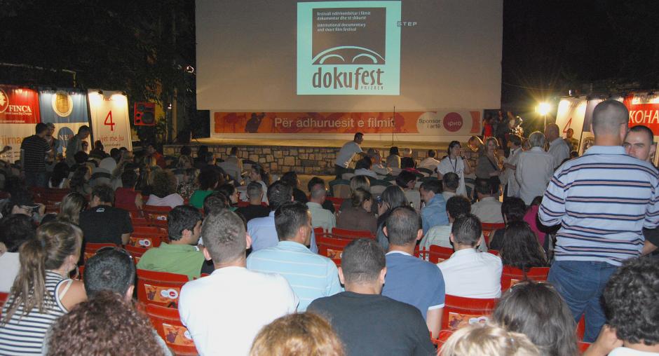 Film fans at the improvised outdoor cinema Lumbardhi (White River) wait for the awards ceremony to begin on the last day of Dokufest, the international documentary and short film festival held in Prizren, Kosovo, from 4 to 10 August 2008. (OSCE/Hasan Sopa)