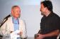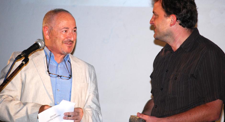 Director of the OSCE Regional Office in Prizren, Lorenzo Gasca Allue (left), hands German film director Ben Kempas the OSCE Human Rights Award offered at Dokufest 2008 in Prizren, where nearly 140 documentaries and short films competed, 10 August 2008. (OSCE/Hasan Sopa)
