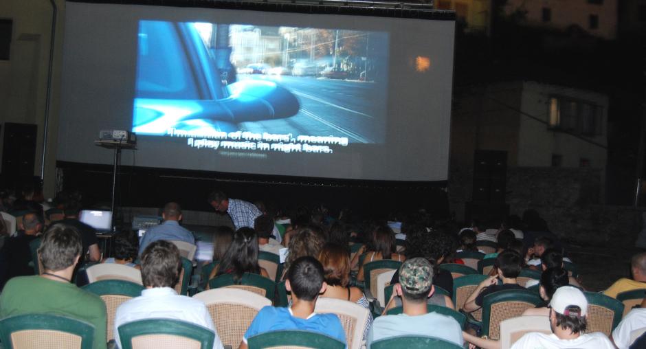 Film fans enjoy a late night movie at the improvised outdoor cinema Nënkalaja (Under the Fortress) at Dokufest, Kosovo's largest documentary and short film festival, taking place in Prizren from 4-10 August 2008. (OSCE/Hasan Sopa)