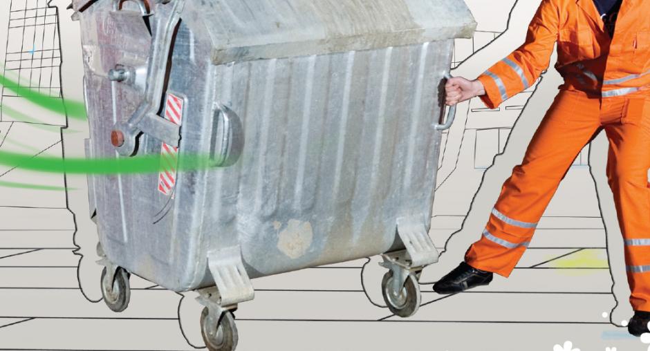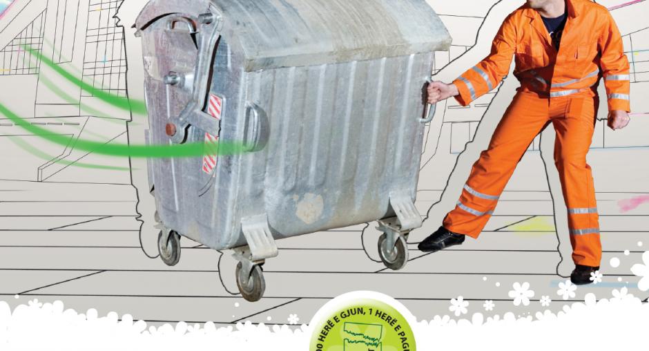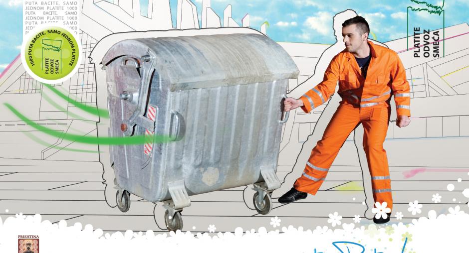 This campaign image for a city light calls on the public to pay their garbage-collection bills with the message "1000 times to throw, one bill to pay: pay the garbage-collection bill." The slogan is "...for a clean Pristina!" (OSCE)