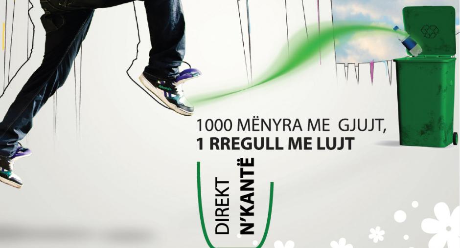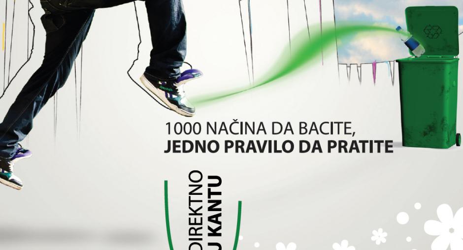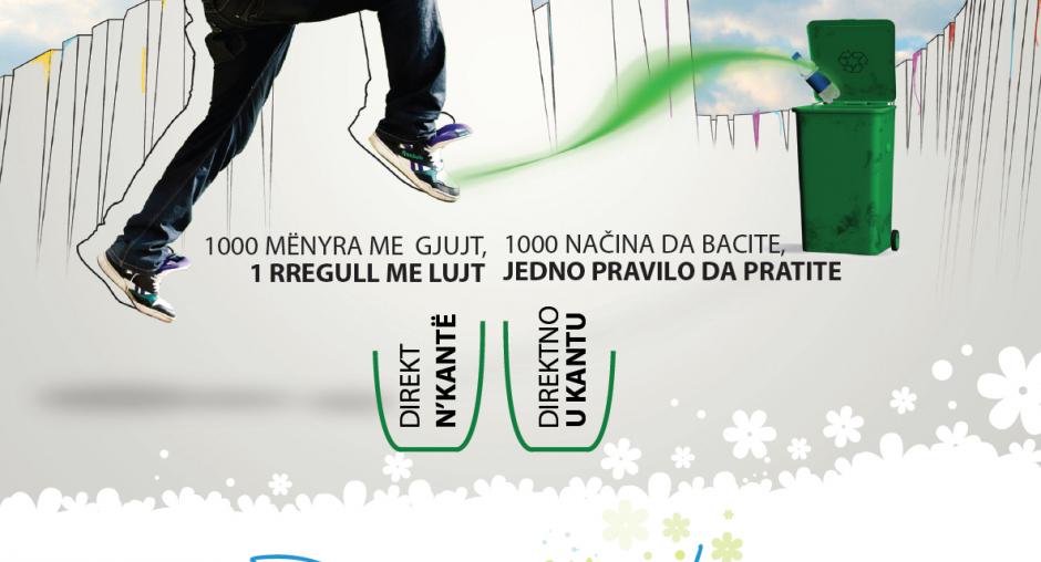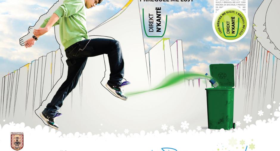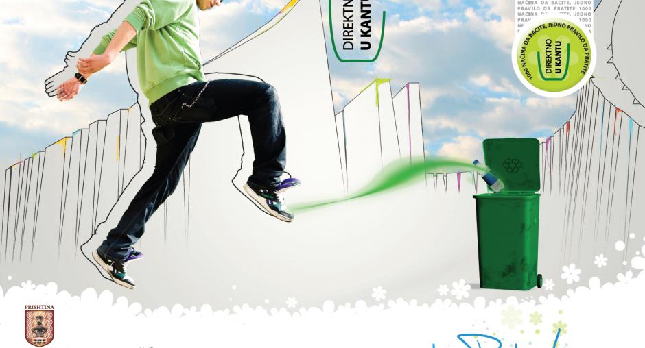 This campaign image for a city light calls on the public to use garbage bins with the message "1000 ways to thrpw, one rule to follow: directly to bin". The slogan is "...for a clean Pristina!" (OSCE)