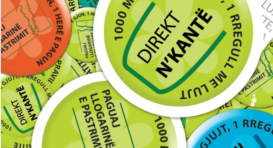 Pullup screen with the message "1000 times to throw, one bill to pay: pay the garbage-collection bill." The slogan is "...for a clean Pristina!" (OSCE)