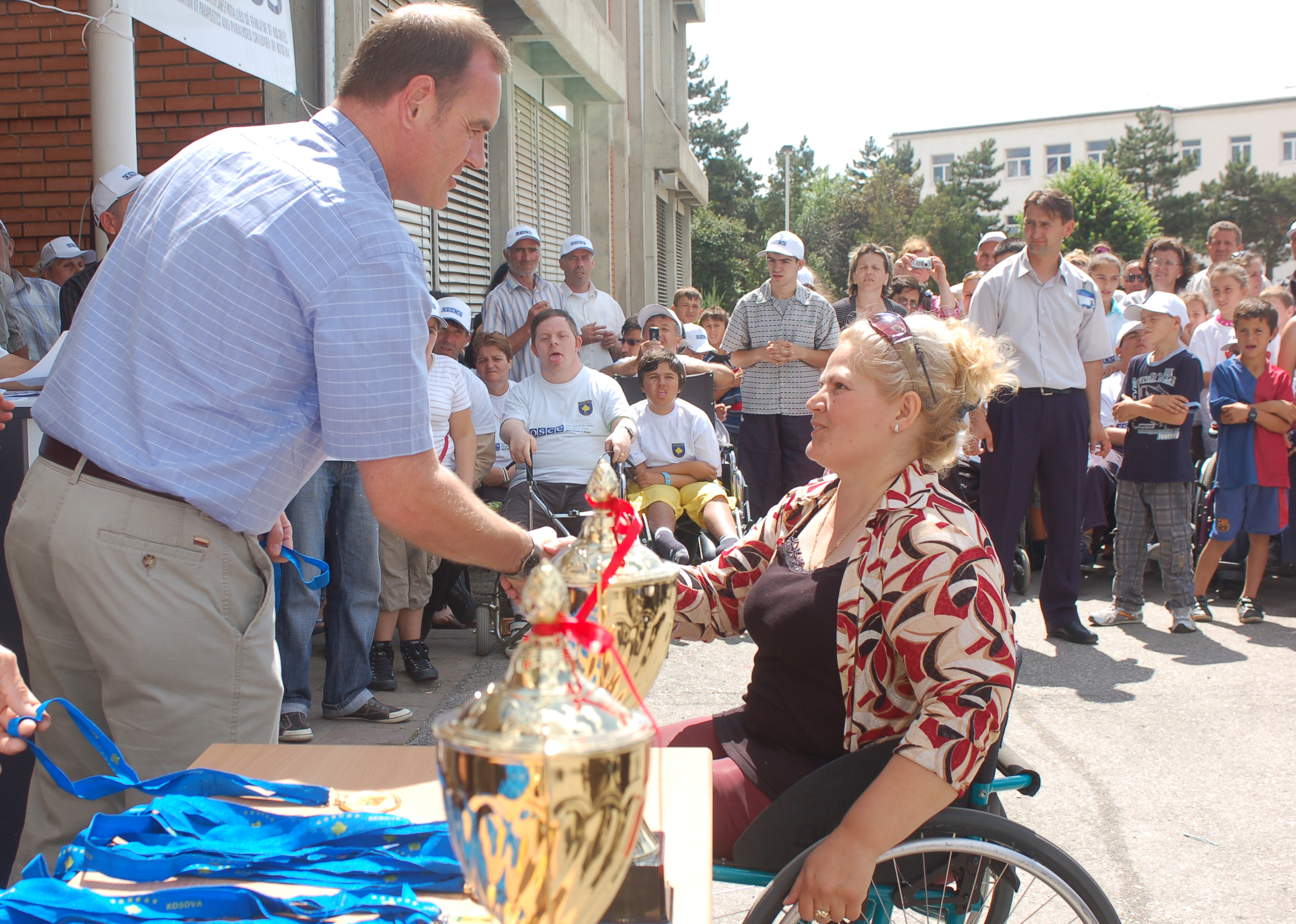 Carsten Twelmeier, director of the OSCE Department for Security and Public Safety, hands out medals for the participants of the mini Olympics for Disabled Youth organized by the Mission, Vushtrri/Vucitrn, 18 June 2010.