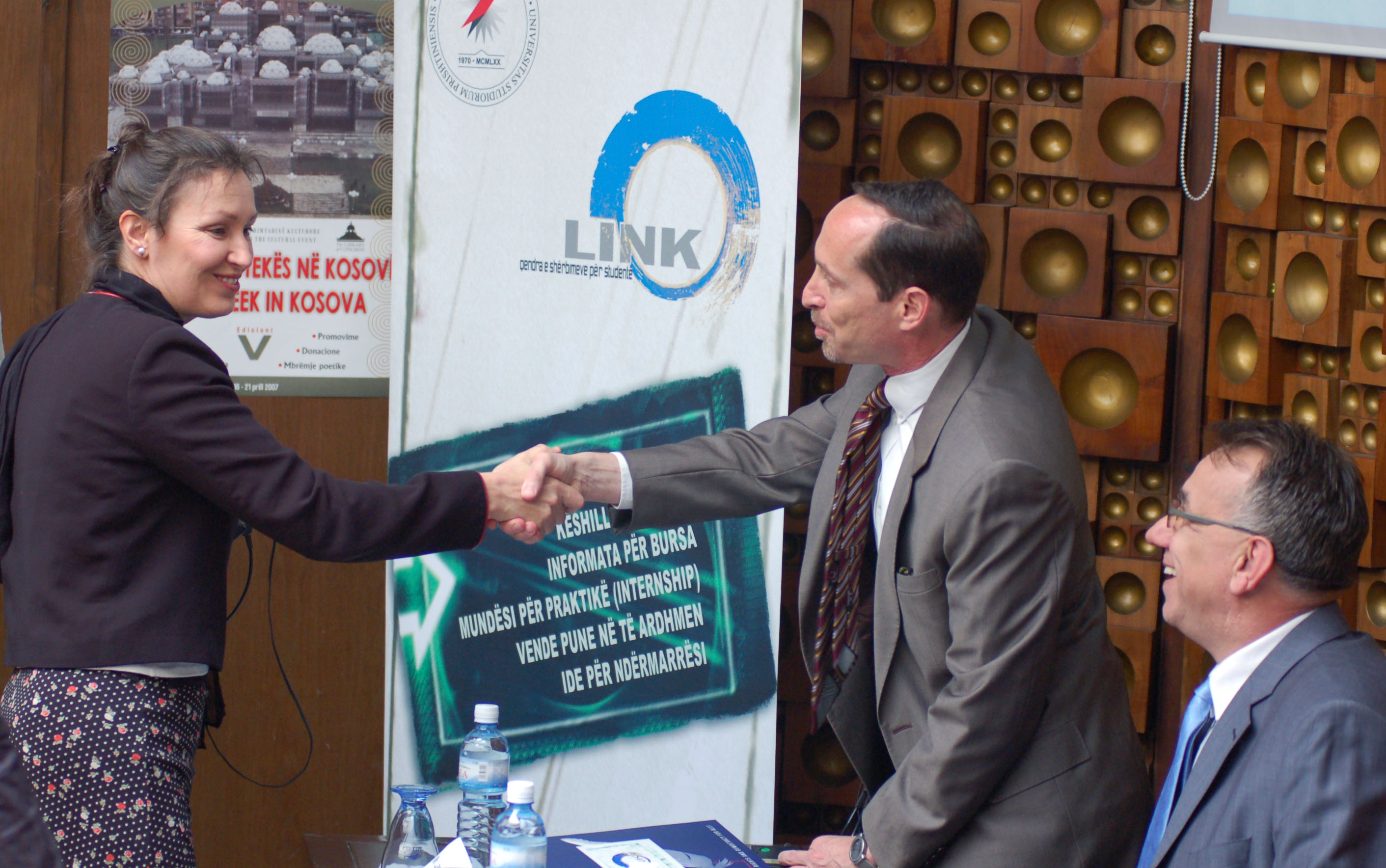 Wilma Theuws (left), of the OSCE Mission in Kosovo, shakes hands with Lawrence Corwin from US Office in Kosovo and Pristina University rector Enver Hasani (seated) at the opening of an OSCE-supported Student Services Centre, 24 April 2007.
