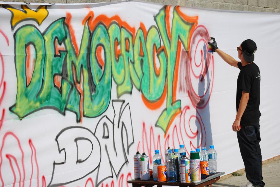 An artist in Rahovec/Orahovac creates a graffiti work at an event organized by the OSCE Mission in Kosovo to mark International Democracy Day on 15 September 2010. The Mission ran 35 local events under the slogan "Accept the Challenge of Democracy!"
