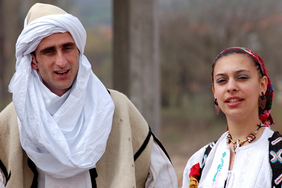 An Albanian boy and a Roma girl in traditional costume getting ready for a joint dance at a ceremony to mark the return of the Roma community to Roma Mahala, Mitrovice/Mitrovica, 30 March 2007.
