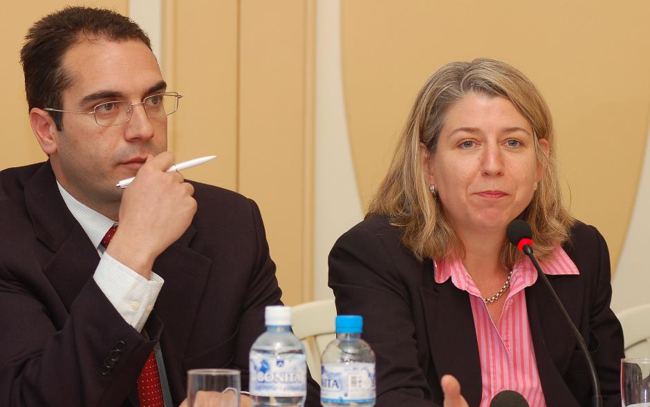 Lavdim Krasniqi (left), Acting Director of the Kosovo Judicial Institute, and OSCE Co-ordinator, Melissa Stone, at a roundtable organized by the Mission in Kosovo on implementing the Law on Anti-Discrimination, Prishtine/Pristina, 18 April 2007.