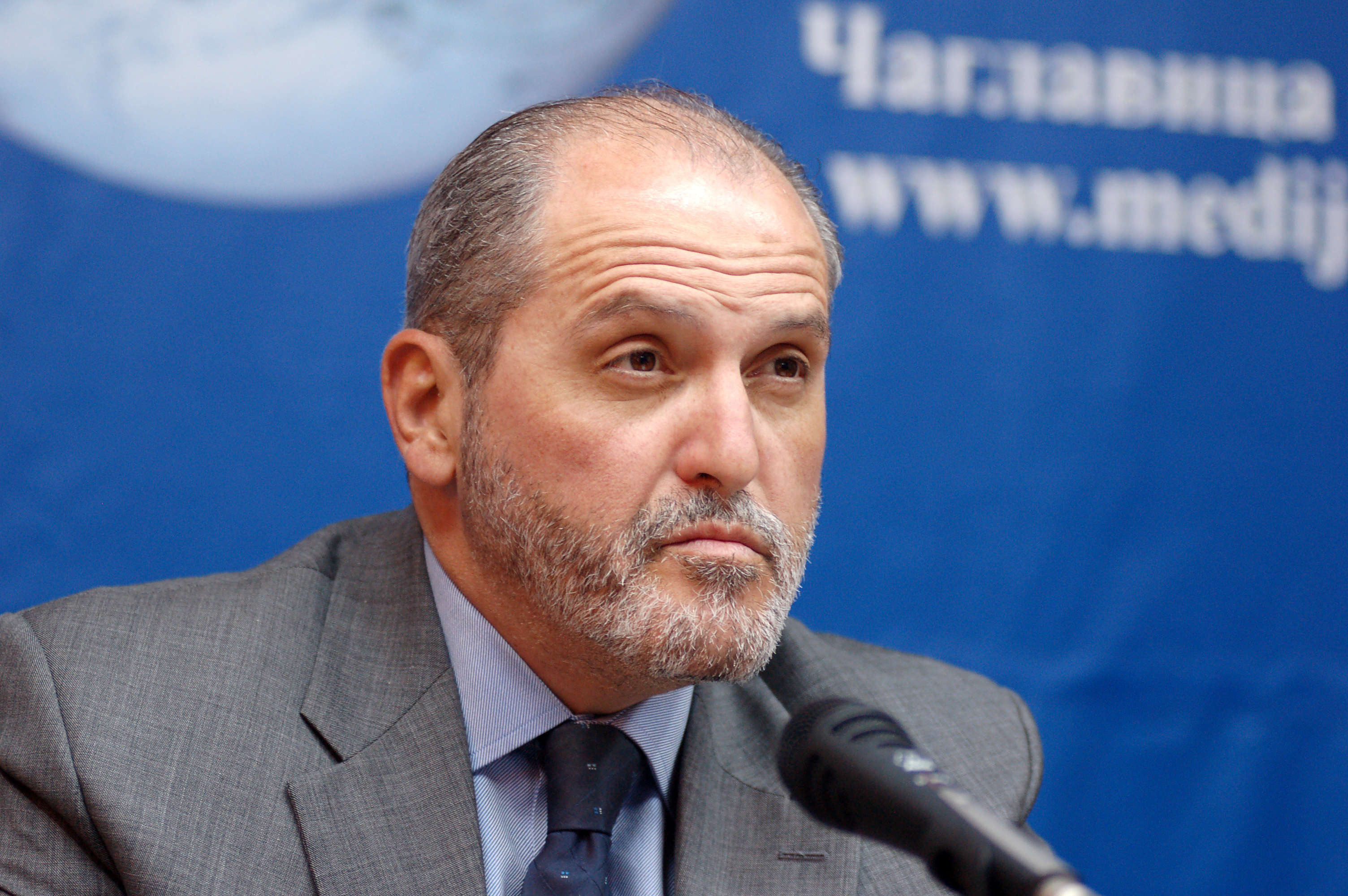 Veton Surroi, a member of the Kosovo Assembly, explains the view of the Kosovo Albanian delegation on status talks at a newly-opened Media Centre in the Serb enclave of Caglavica/Cagllavice, south of Prishtine/Pristina, 10 April 2007.