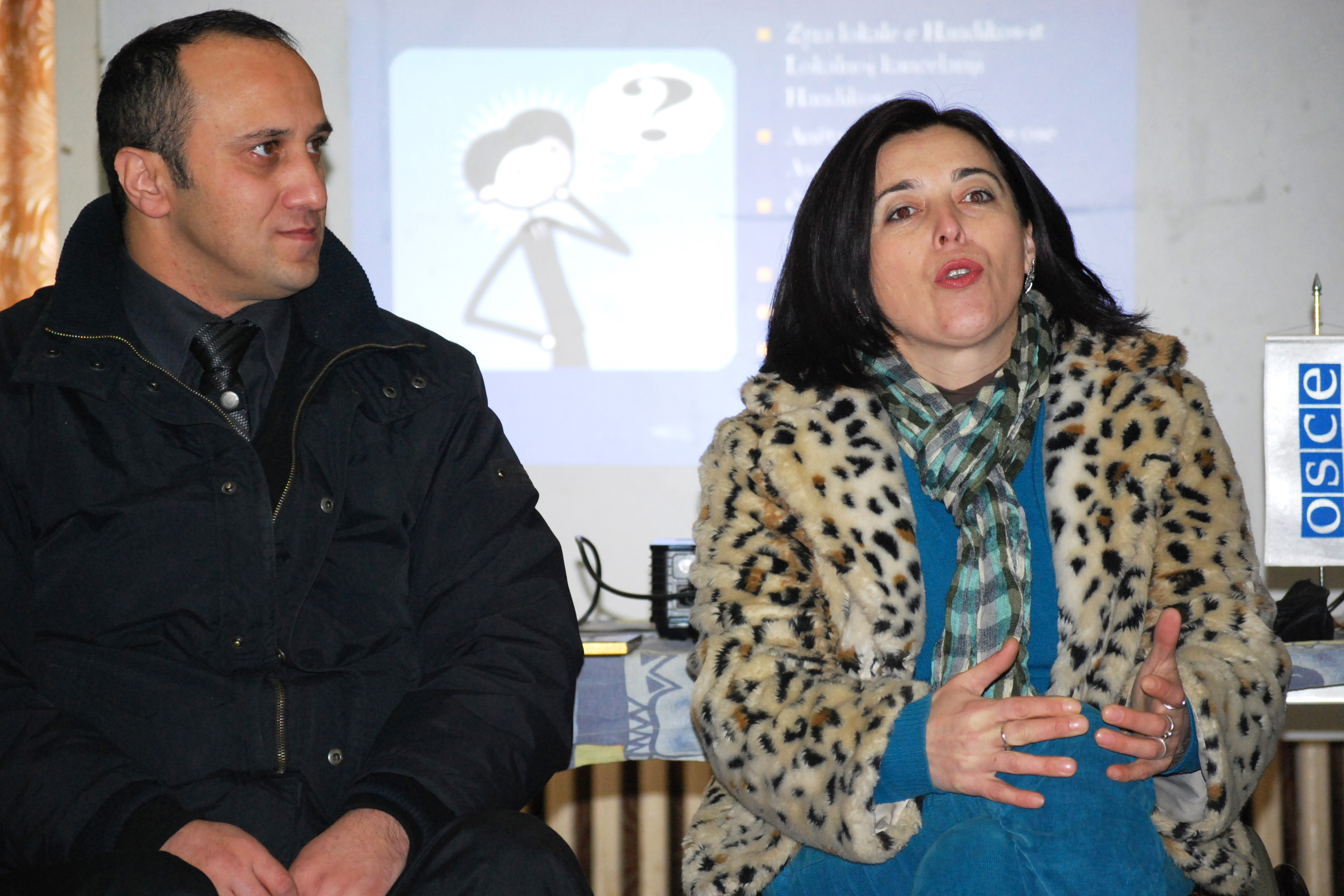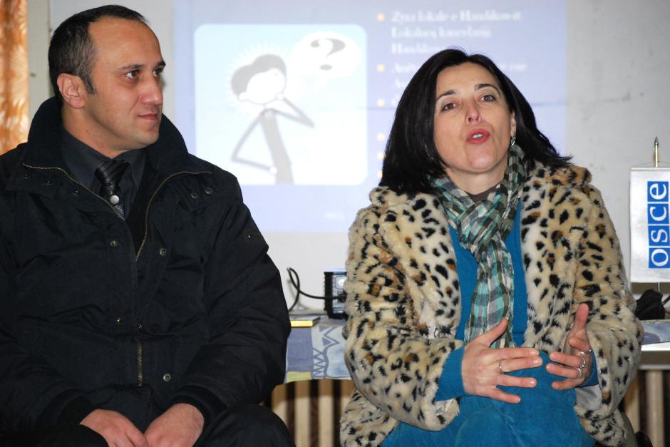 L-r: Afrim Maliqi, Handikos Director, with Xhemile Murseli, Handikos Branch Manager, thank the OSCE Mission in Kosovo for the donation of 20 wheelchairs, Ferizaj/Urosevac, 24 February 2011.