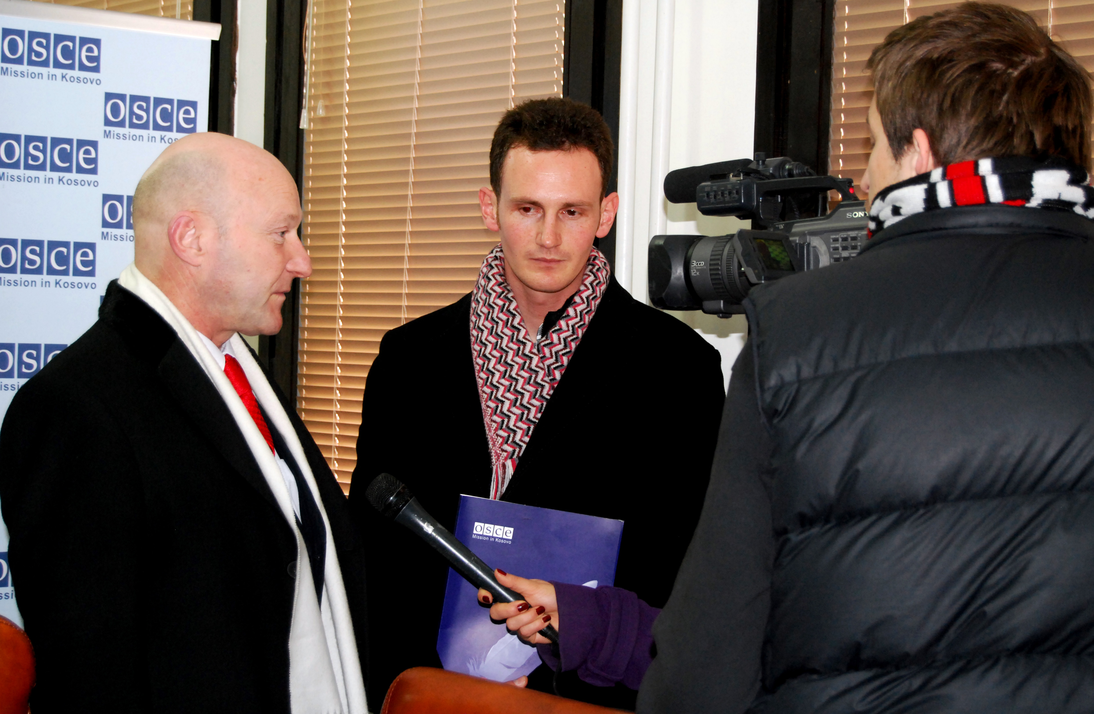 Ulrich Biffar (l), Director of the OSCE Mission in Kosovo's Regional Office in Gjilan/Gnjilane gives an interview to a local TV station at a ceremony for the donation of 20 to local people, Strpce/Shterpce, 24 February 2011.
