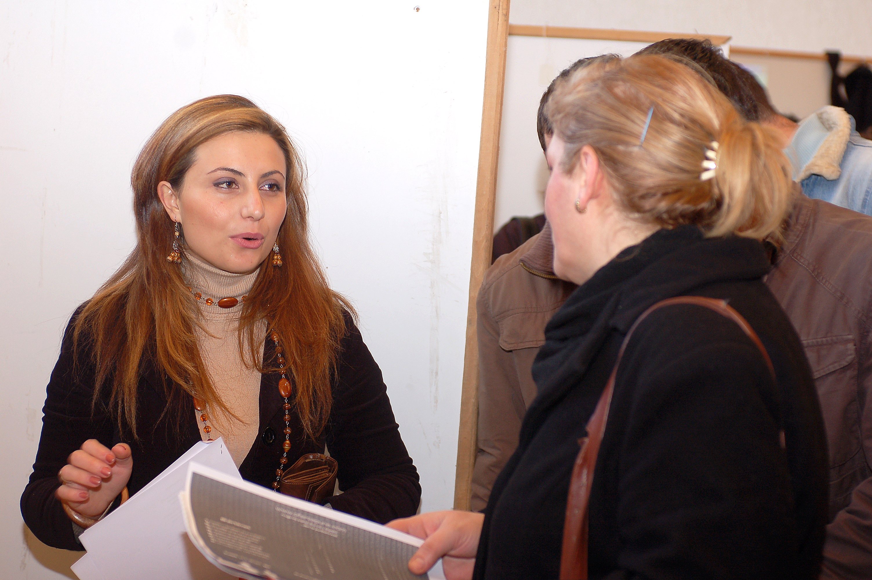 A representative of a private company hands out profile leaflets and explains application procedures at an employment fair supported by the Mission in Kosovo, Prishtine/Pristina, 5 December 2007.