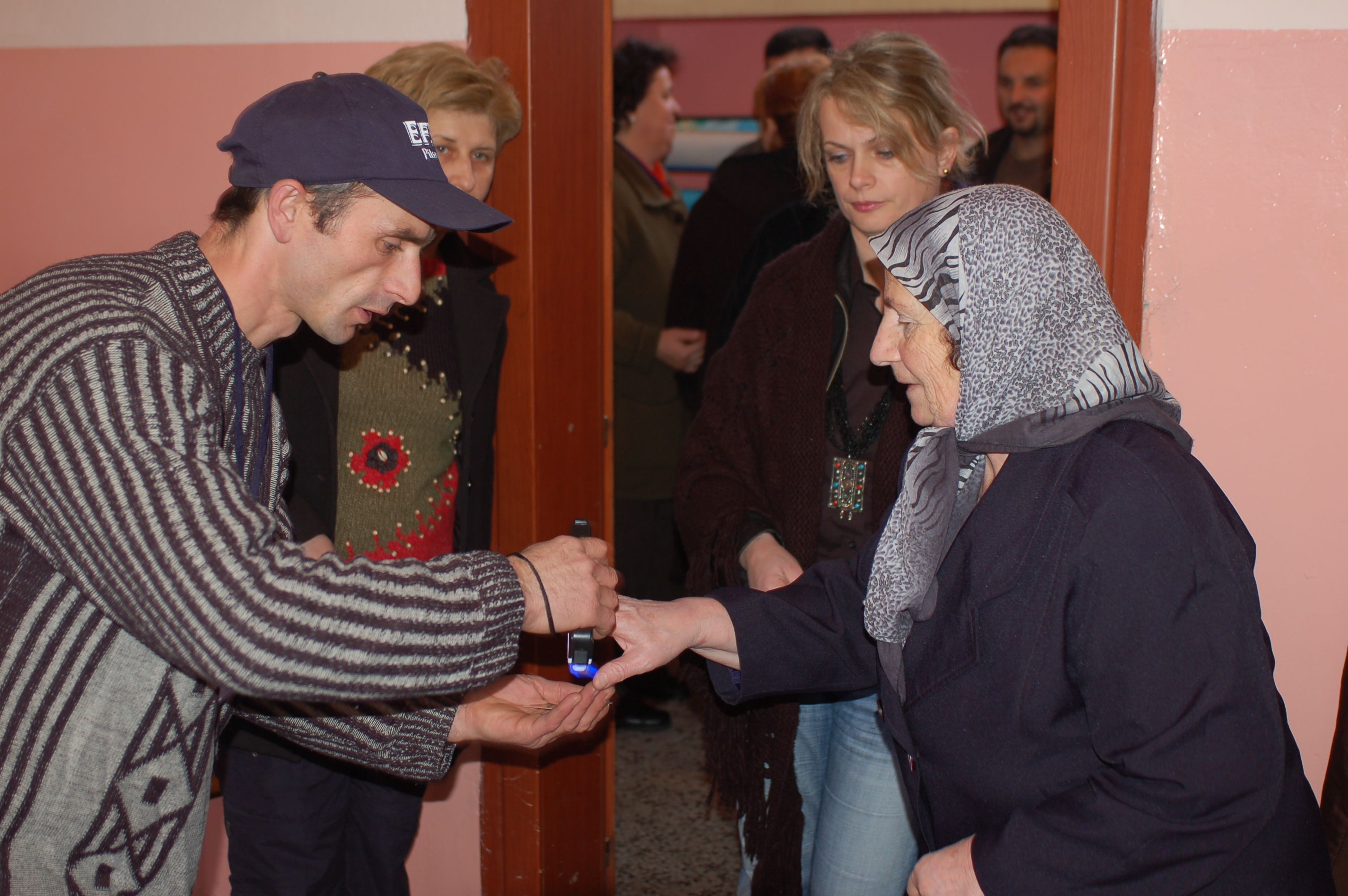 An election official at "Motrat Qiriazi" Primary School polling station in Prizren checks voters' fingers at the station's entrance during Kosovo's elections, 17 November 2007.