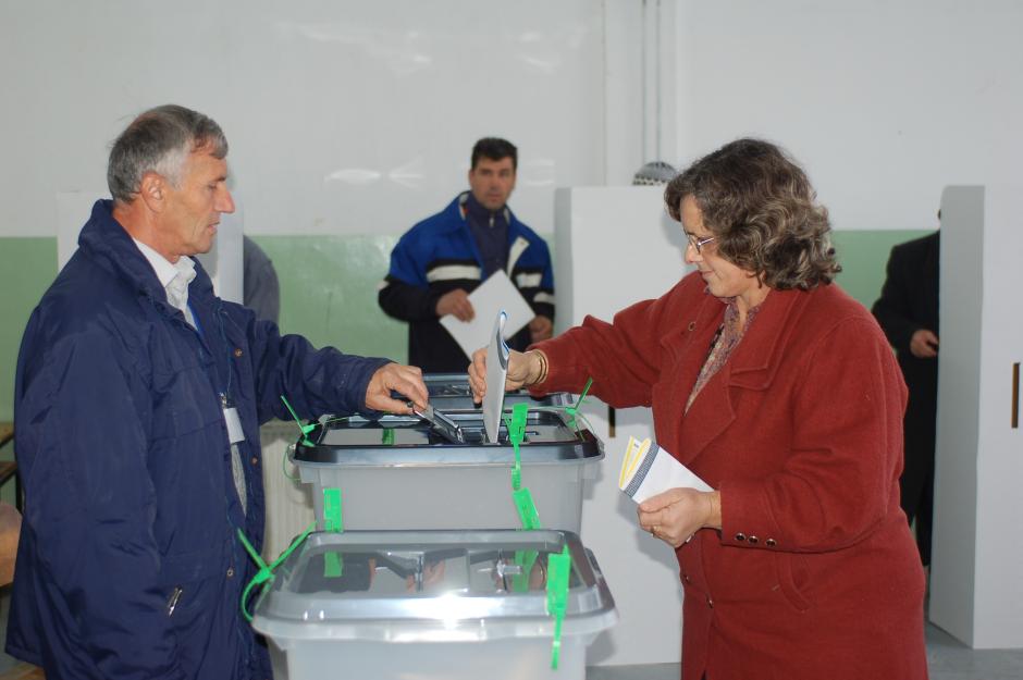A voter casts her ballot at "Motrat Qiriazi" Primary School polling station in Prizren Municipality during Kosovo's elections, 17 November 2007.