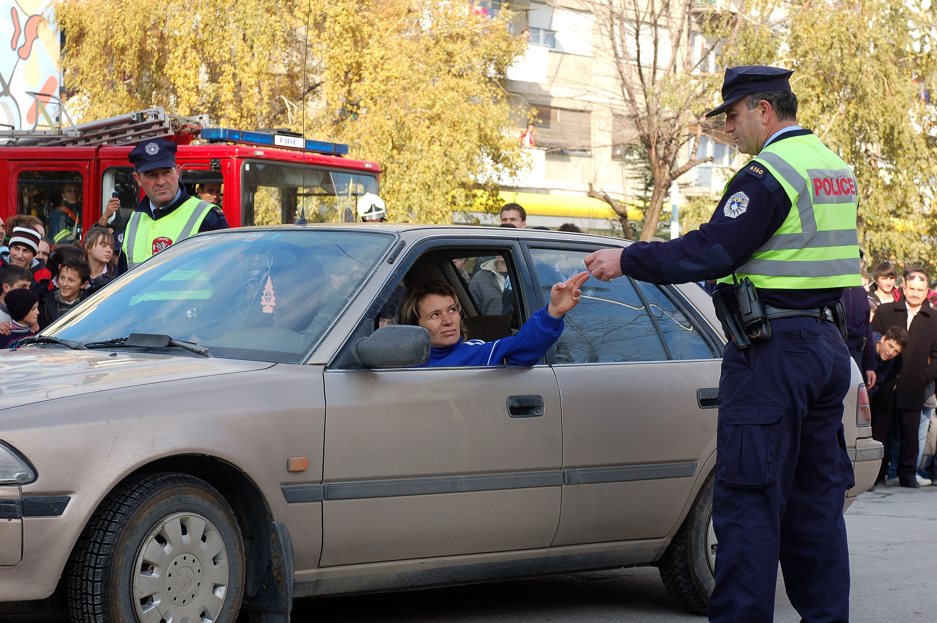 Kosovo police officers during a traffic simulation exercise in front of hundreds of school children and citizens as part of the Open Day supported by the OSCE Mission in Kosovo, Gjilan/Gnjilane, 20 November 2007.